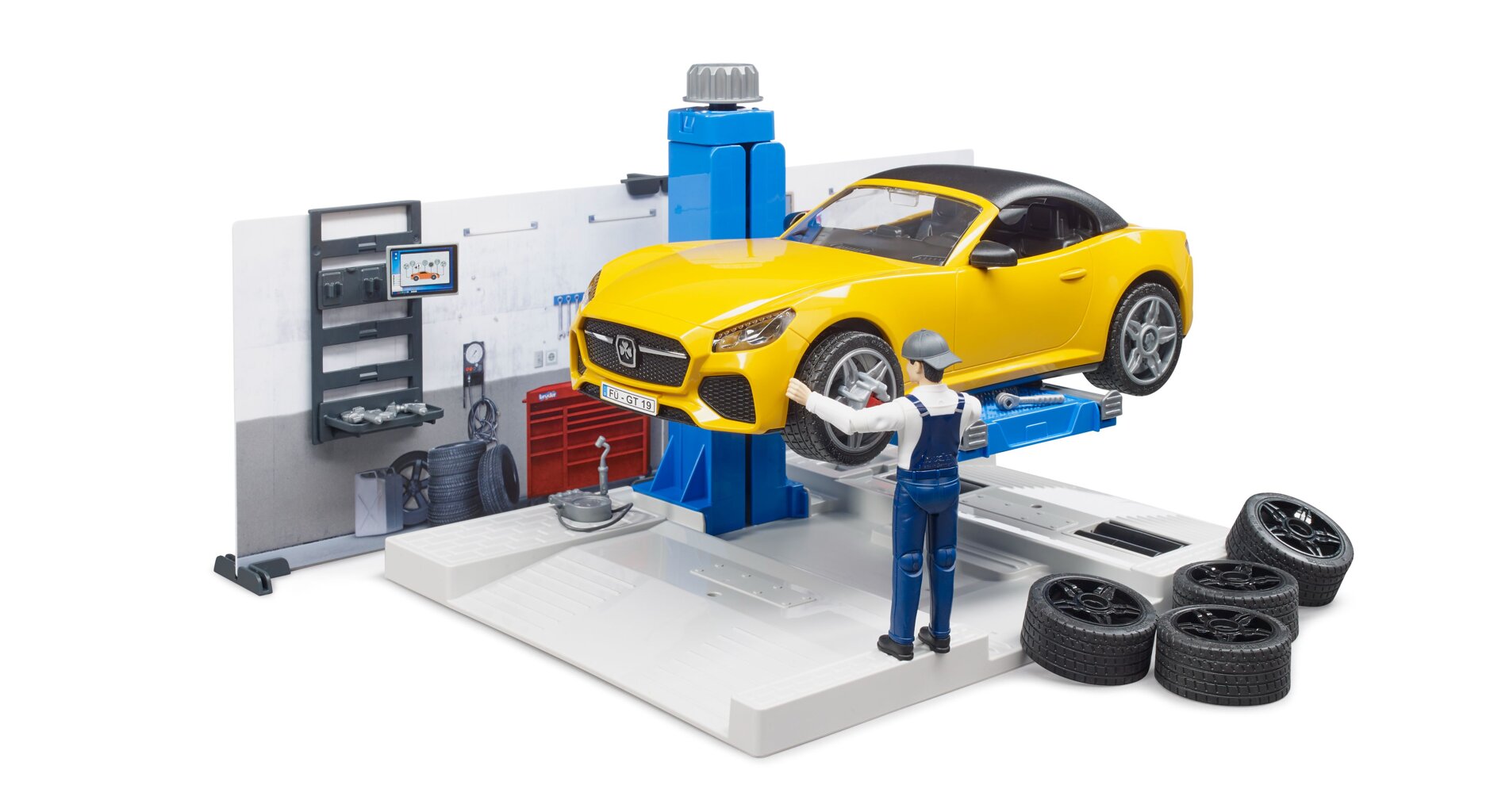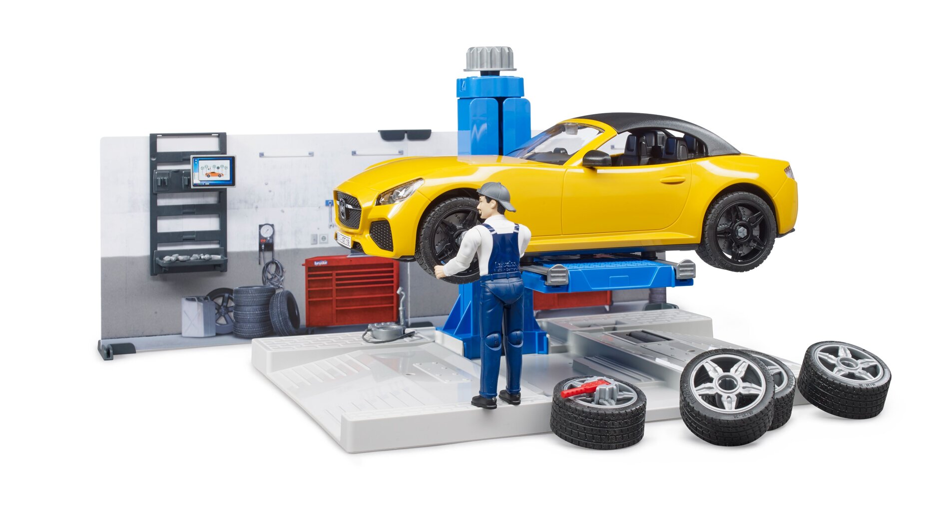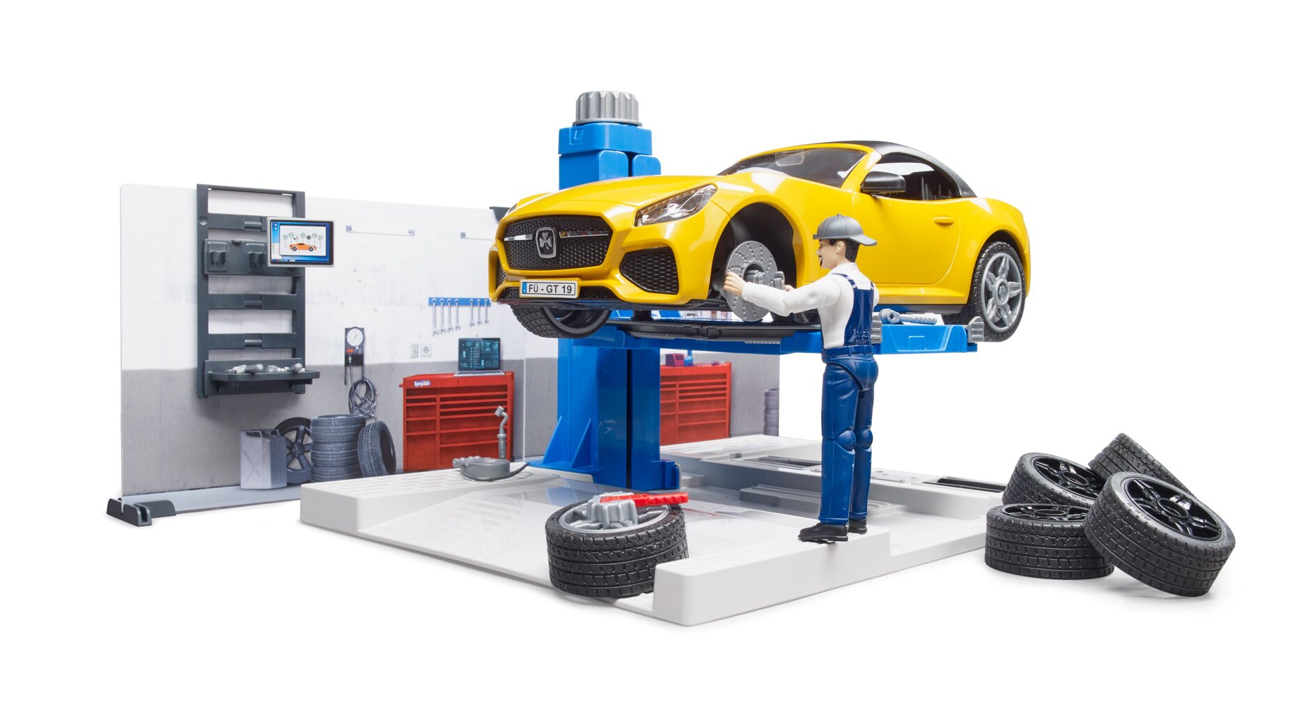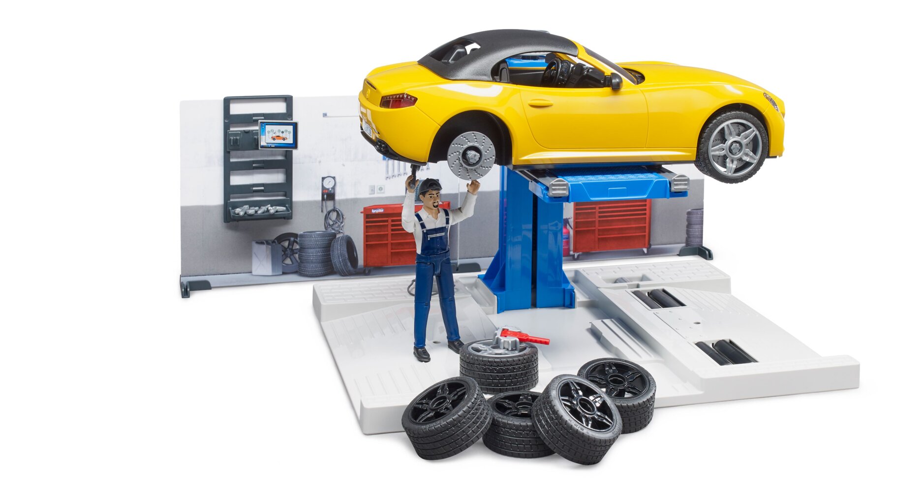 The new car service is the starting point for all your Bruder cars in need of repair. On the lifting platform, the mechanic can inspect the vehicles, check the brakes and immediately see the result on the monitor.