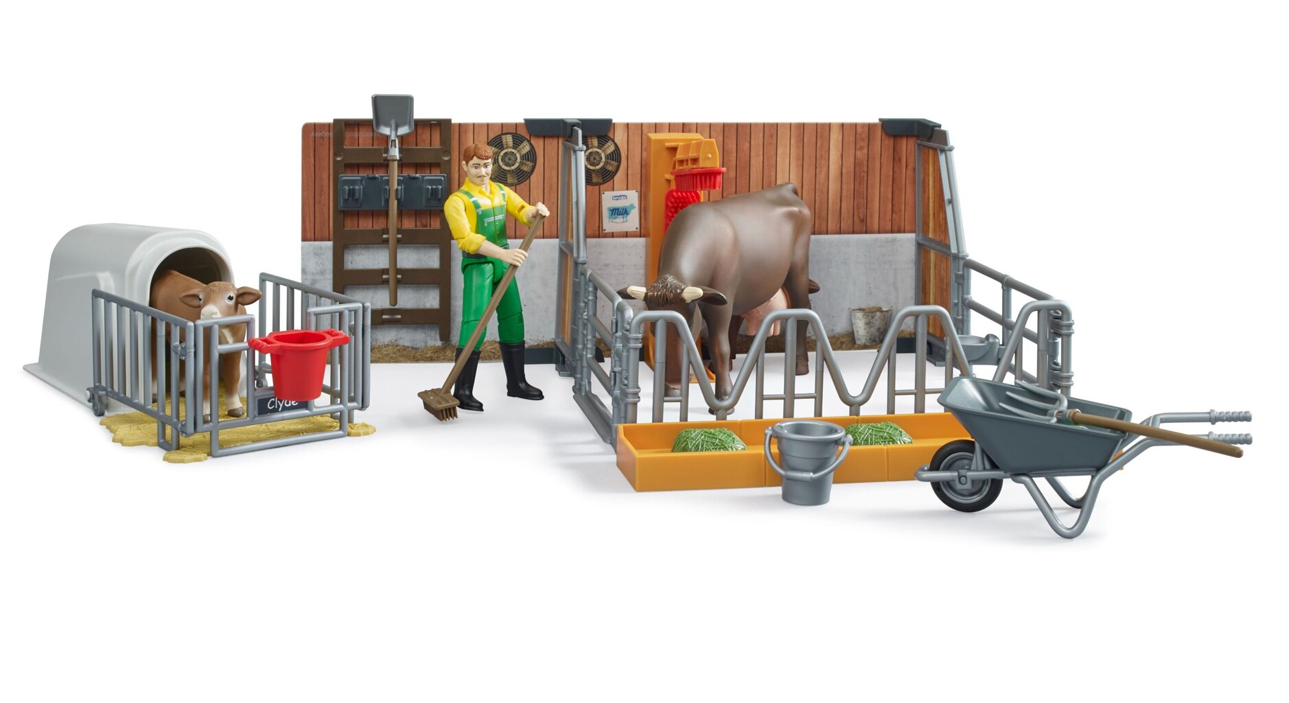 In addition to the already known cows and bulls, there is now a matching calf in the Bruder range. The brand new bworld cow and calf shed theme set includes a modern stable for the cow with feed trough and massage brushes. A calf box with drinking bucket is included for safe accommodation of the calf. Both animals are well looked after by the farmer, who is also included, who uses wheelbarrows and accessories to both feed and clean the shed.