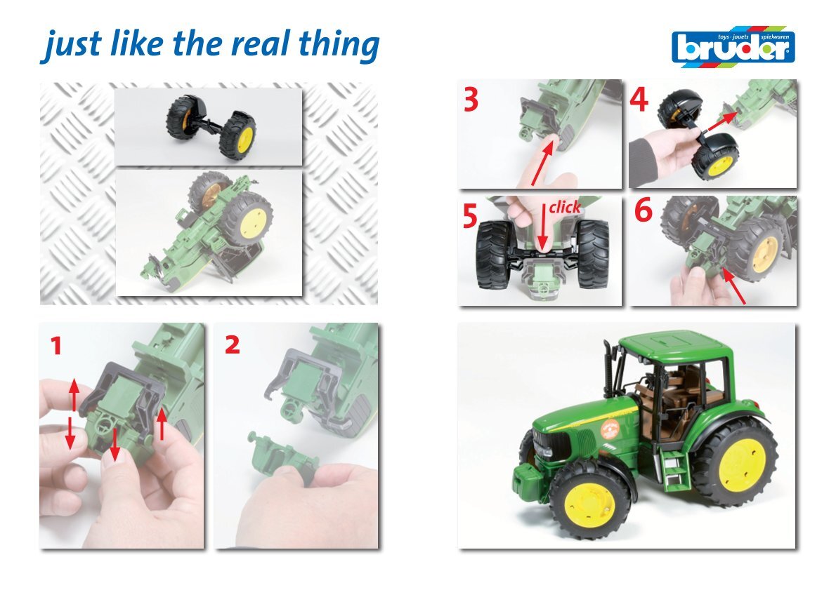 Easy assembly makes replacing a damaged or worn axle quick and simple, so your Bruder tractor can be ready for your next play adventure or collection display in no time. The replacement part is fully compatible with the John Deere 6920, ensuring perfect functionality and preservation of all original features.