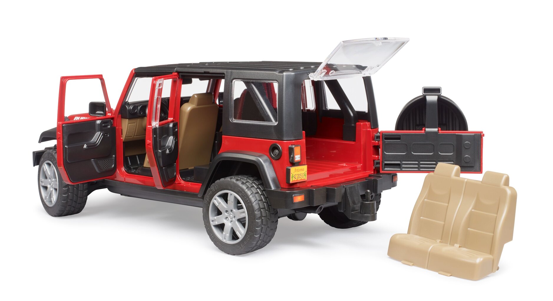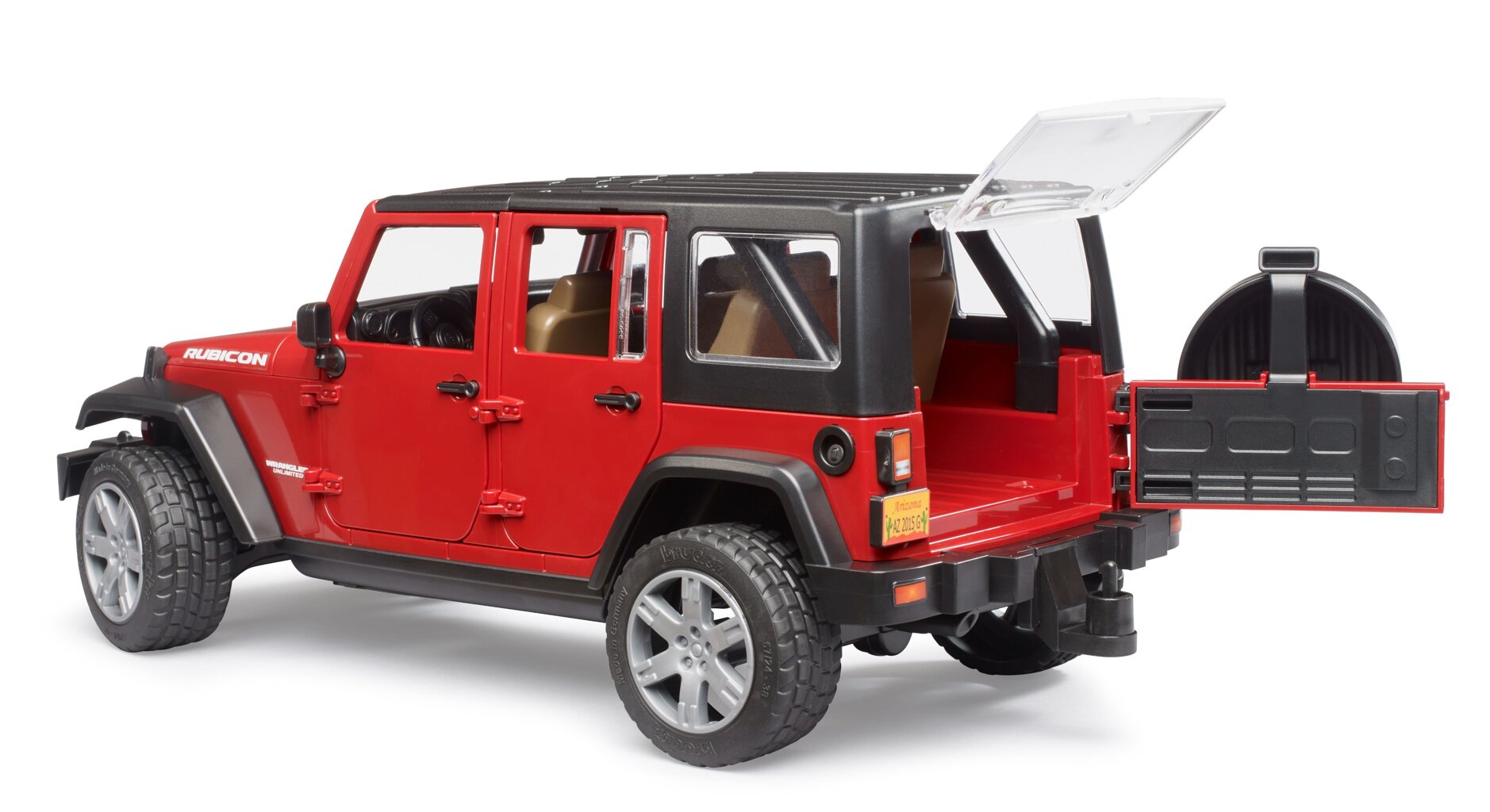 The Jeep Wrangler Rubicon off-road model will light up the eyes of every boy. This model stands out for its very detailed and high-quality manuacturing, it is produced in a scale of 1:16. In addition to its great appearance, it also impresses with fun features - it can be driven using an extended steering wheel , all doors can be opened and it also has a towing device, thanks to which Bruder trailers can be attached to it.
