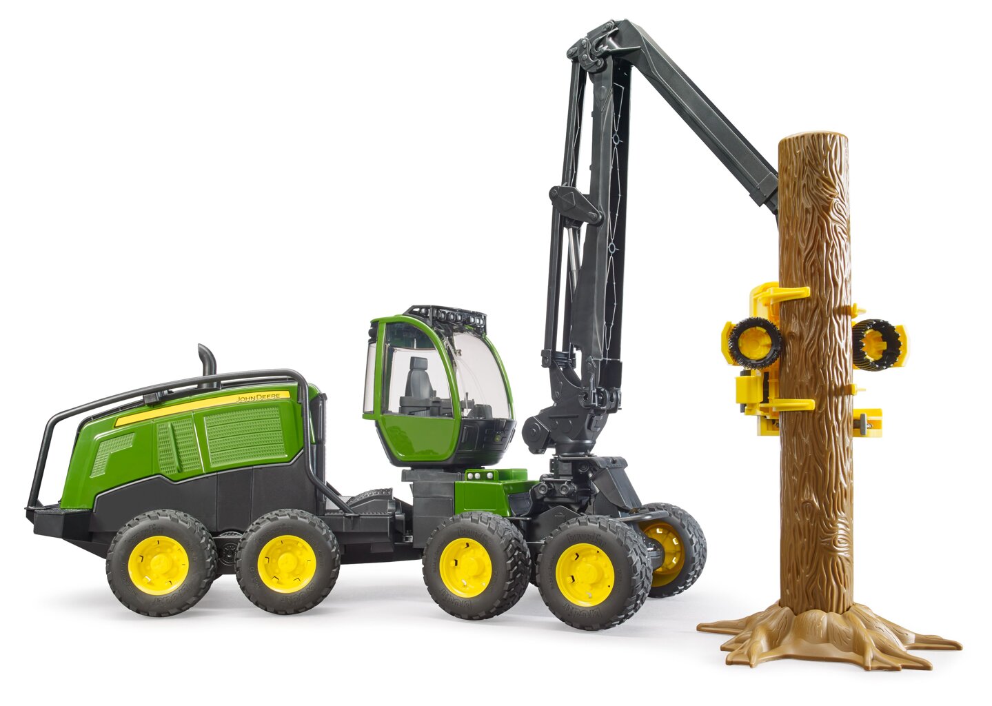 With its 8 wheels, the 1270G variant stands out for its maximum stability and ability to handle almost any terrain. The cab of this model swivel by 360°, its doors can be opened and is compatible with Bruder figures. The chassis is equipped with pendulum axles for handling difficult terrain. The harvester head is mounted on a fully movable arm. The unit is equipped with grippers, transport rollers and sawing unit. Kids can start logging right away, the set includes a tree trunk with removable roots.