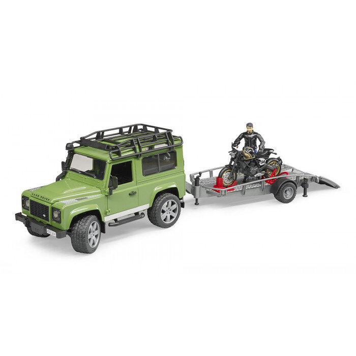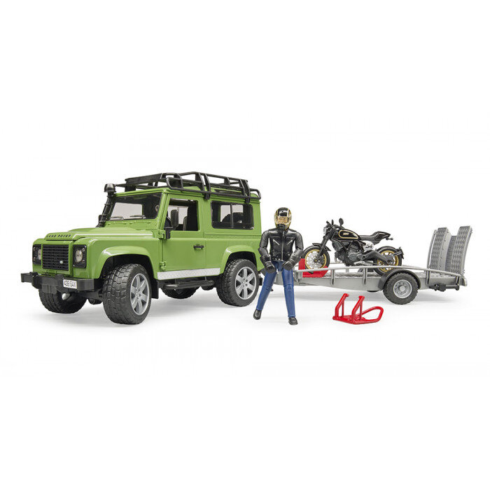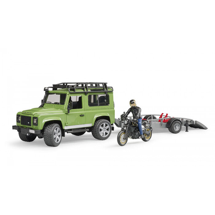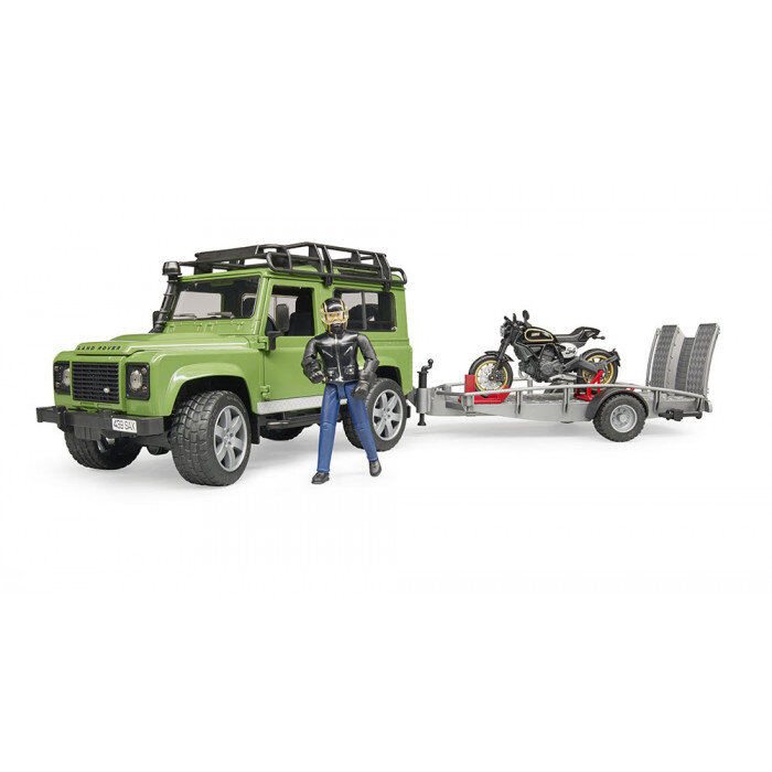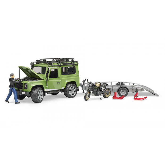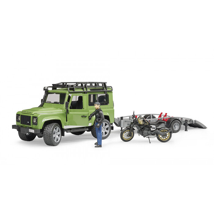 Land Rover Defender with trailer, Ducati Scrambler Cafe Racer and driver - Bruder 2598