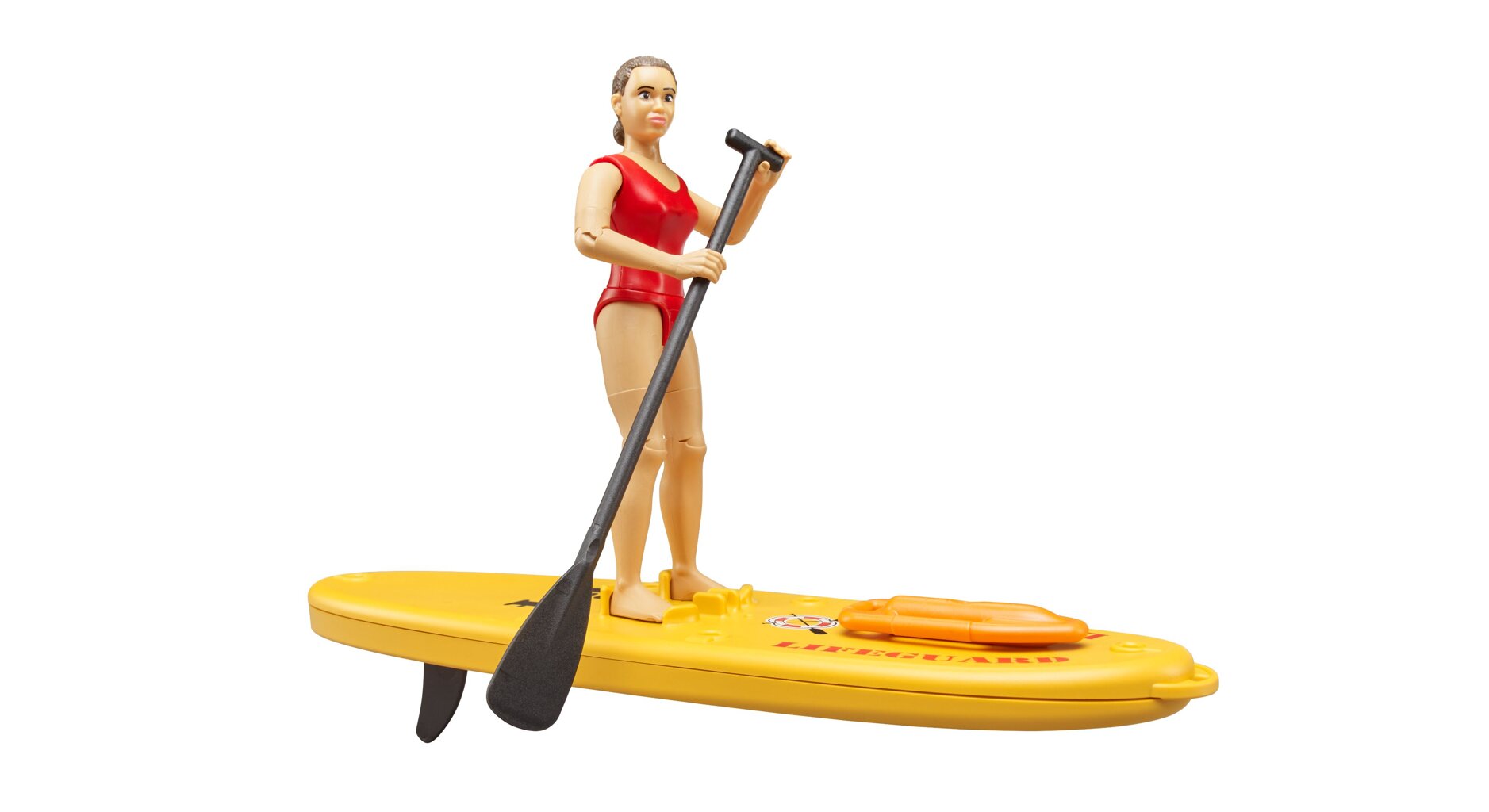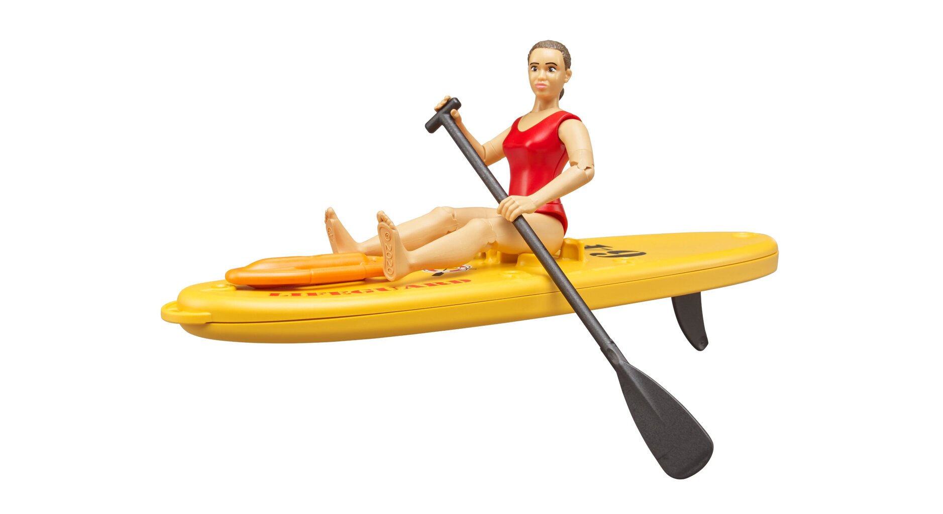 For a growing number of water sports enthusiasts, the Coastguard lifeguard is the new addition to the rescue services. Equipped with her paddleboard and rescue buoy, the lifeguard arrives promptly to any dangerous situation on the water. The kayak with Bruder 63155 figure and the new Bruder 62780 rescue station are particularly suitable accessories for this model.