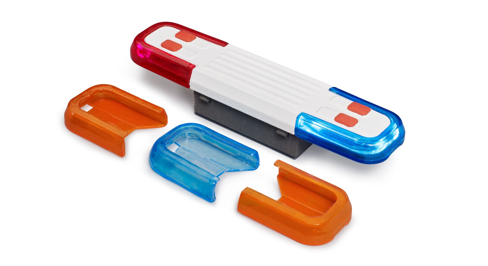 The module can be combined with different coloured light caps - two blue for police vehicles, two orange for service vehicles and one red.