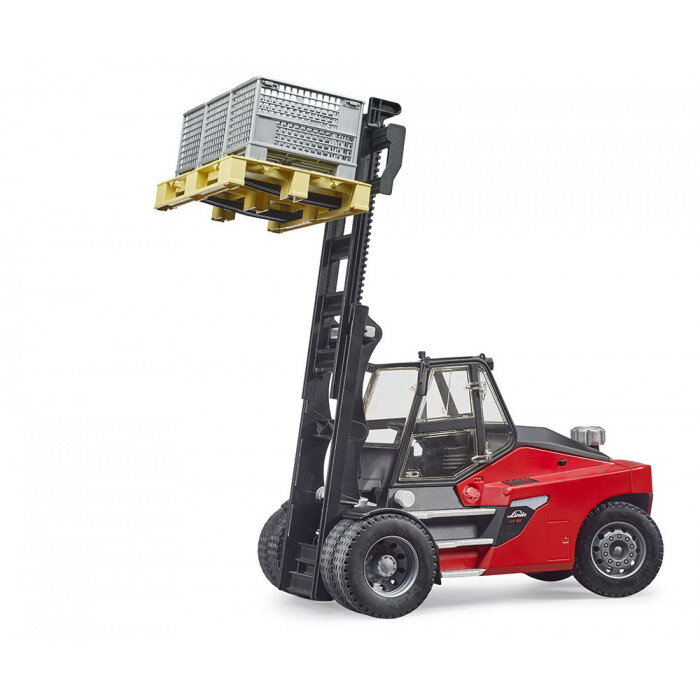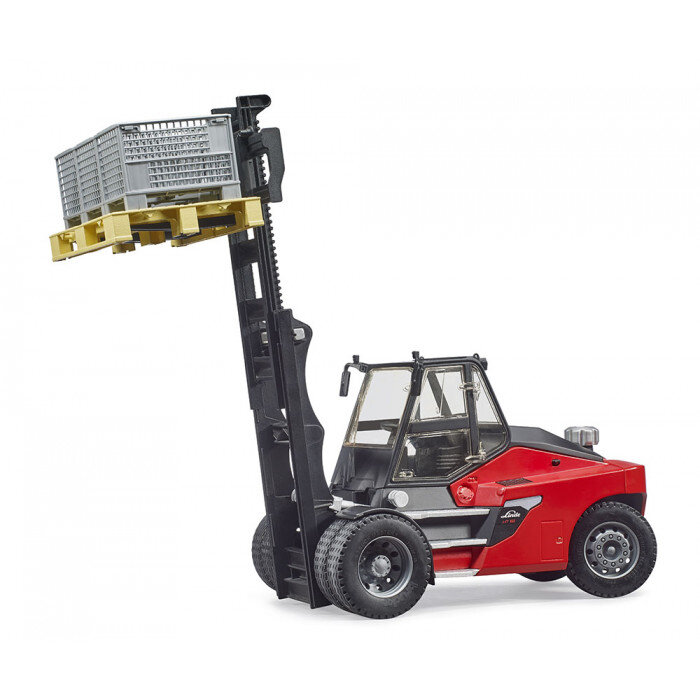 Linde HT models are fast and economical when handling heavy loads. These models ensure particularly high handling performance, especially over long distances. New at BRUDER, the Linde HT160 from this series is a detailed model in the commercial vehicle themed world. The original model features an impressive 16-tonne load capacity, a lifting height of 4 metres and state-of-the-art displays in the driver's cab. The BRUDER model is equal in every detail. The modern cab is fully glazed and provides an optional bworld figure with excellent all-round visibility. The stacker is equipped with a double-lift mast, the lifting and tilting function of which can be operated with one hand. The model has easy-to-operate steering that enables the children to manoeuvre in the tightest of spaces, just like the original. A heavy-duty pallet for transporting large loads and 3 pallet cages are included in the scope of delivery.