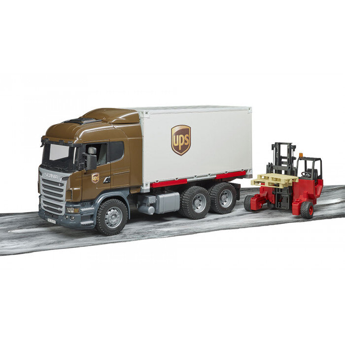 The Bruder model of this dynamic Scania R-series has three axles, openable cab doors, folding mirrors and a removable container. The rear door of the container can be opened. The container can be easily placed outside the truck on support legs. A forklift ensures easy loading and unloading of the load.