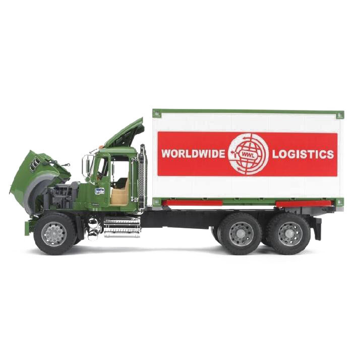 The detailed MACK Granite truck model will provide plenty of fun for any boy. The model is delivered with a forklift and pallets that can be conveniently loaded into its container . The truck has lifting posts and high-lift forks for comfortable handling of the load, and the truck offers opening doors and folding mirrors.