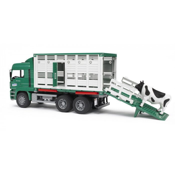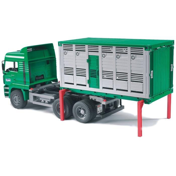 A truck for transporting livestock should definitely be on any proper farm. This detailed model of the MAN TGA car will delight all small farmers. The model has real functions that are a guarantee of wonderful fun . These include a container with a boarding platform for animals, which can also be disassembled into individual parts. Every careful farmer will also appreciate the internal folding grate, openable side doors and two watering holes designed to be hung on the container wall. Other features are extendable support legs and practical folding mirrors.