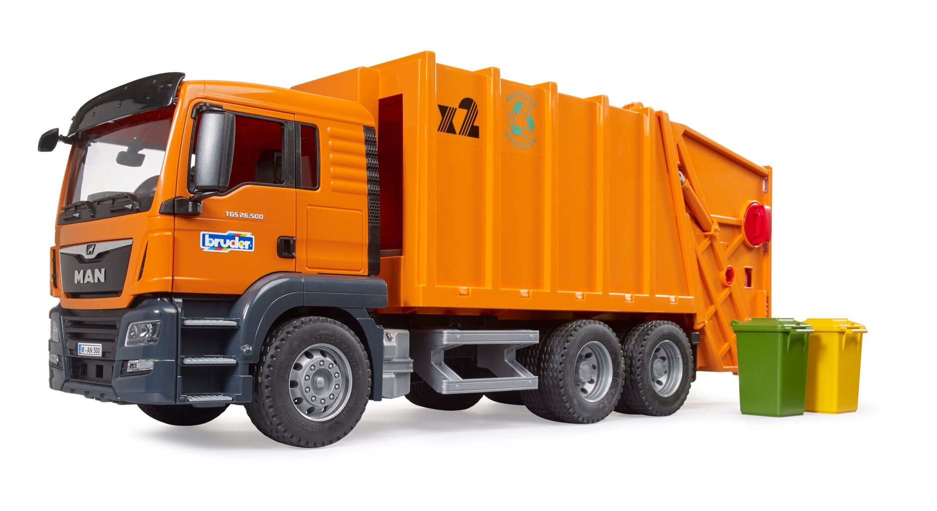 The MAN TGS refuse collection vehicle can be completed with, for example, the Bruder 2607 bin set or the Bruder 62130 municipal worker figure.