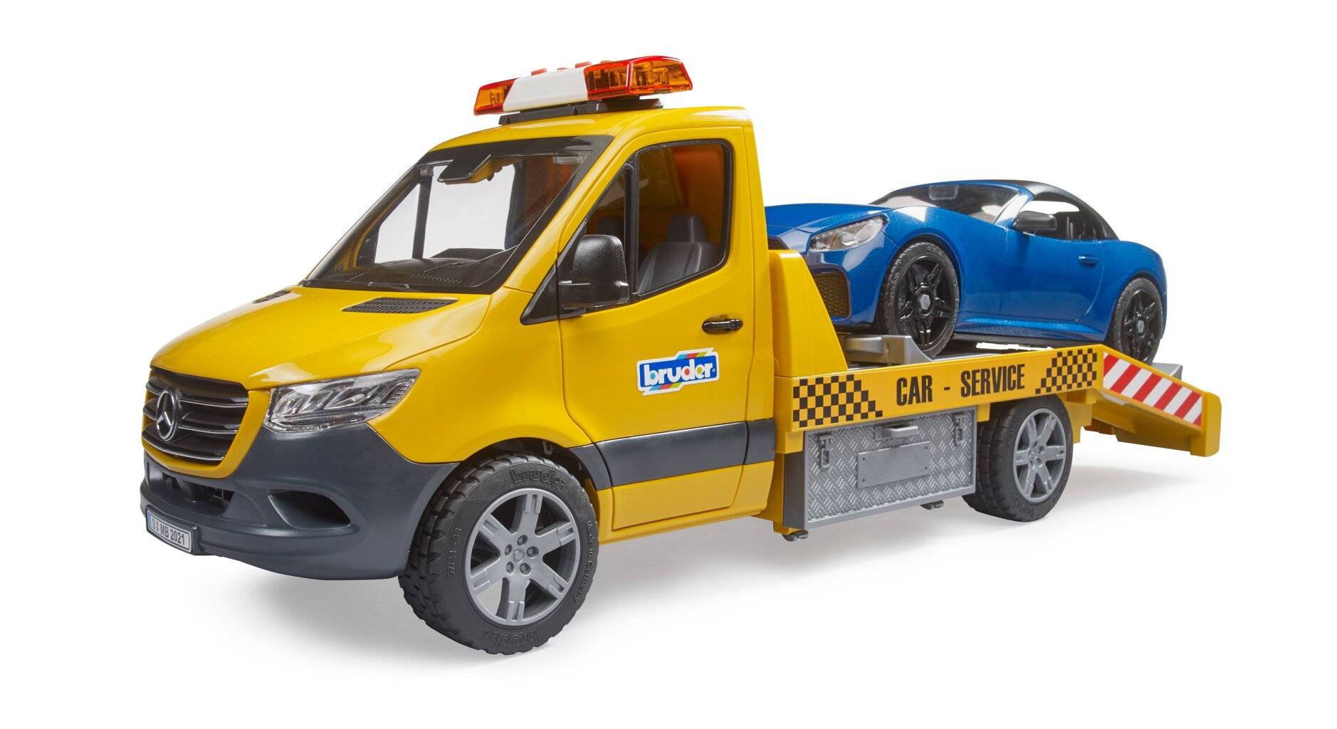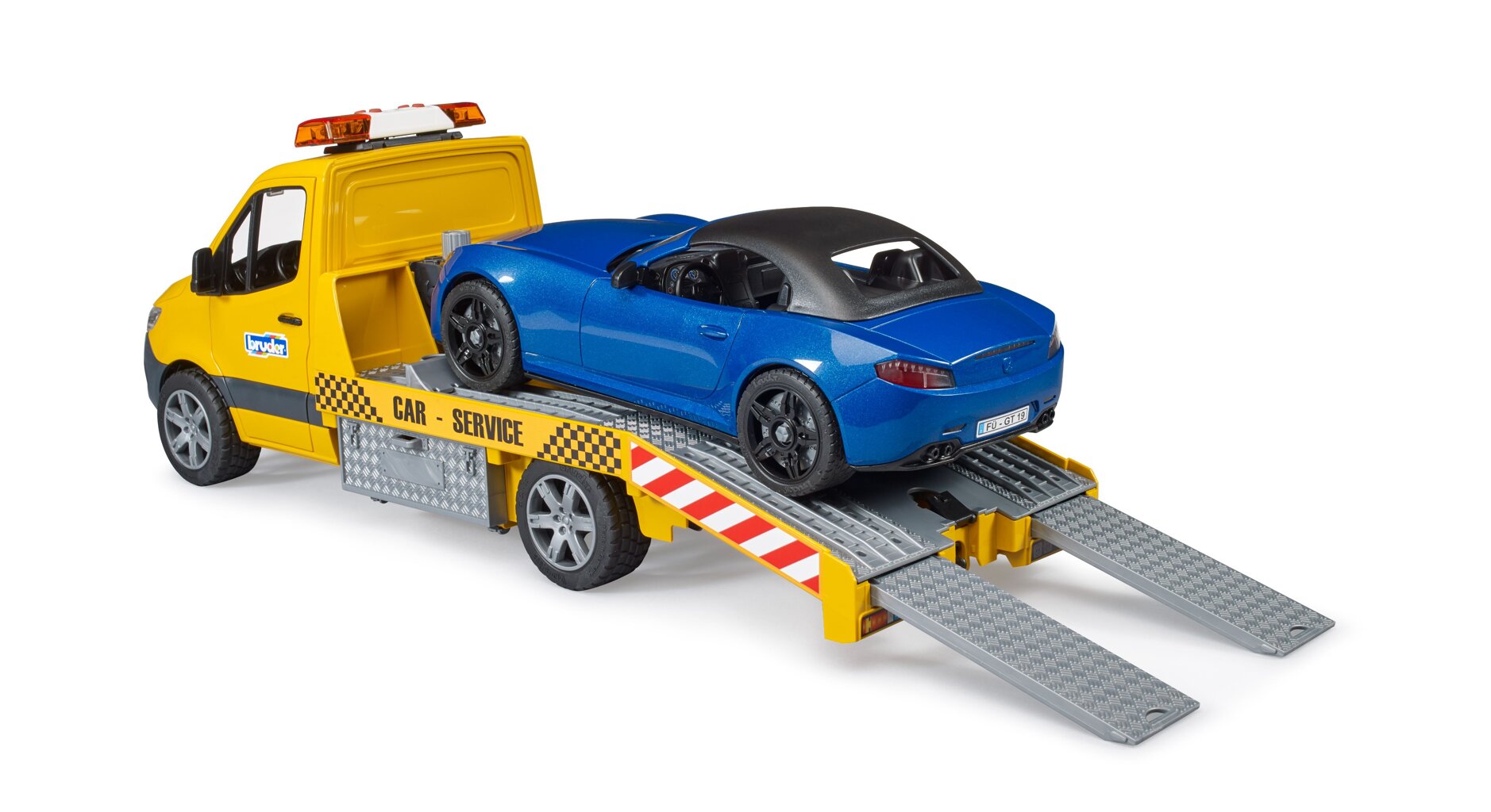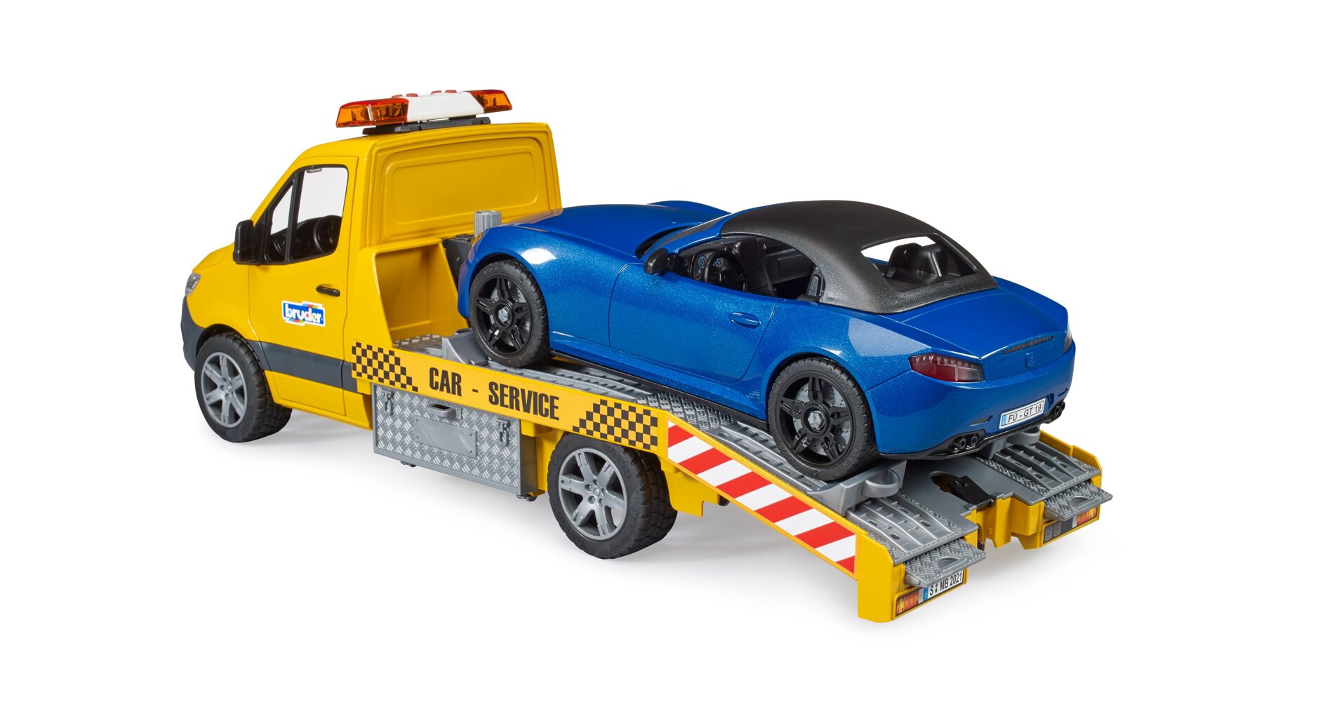 The stylish and modern design of the car transporter is apparent upon the very first glance. The car transporter has a platform that was modelled down to the last detail of the original. In addition to the high-quality doors with interior panelling and the light and sound module, the cable winch is a partcular highlight. With this cable winch, broken-down vehicles can be removed from even the most difficult situations. The side-mounted tool boxes are used to stow the wheel chocks and the access ramps can also be pushed directly into the chassis. The new roadster features a detachable roof and can accommodate any bworld figure. For even more playing enjoyment, the vehicle has the new wheel change system installed.