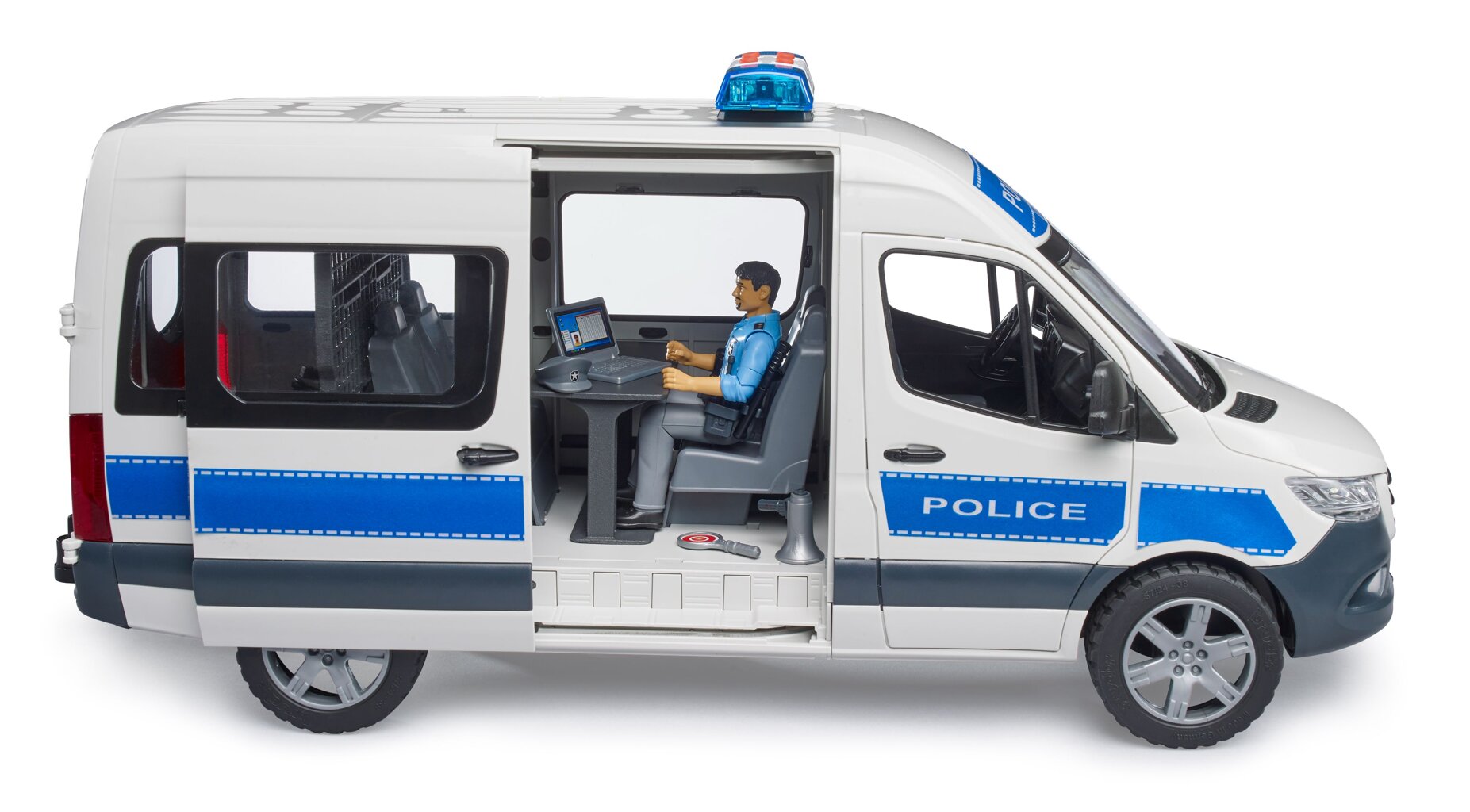 Thanks to the large number of variants, the MB Sprinter offers almost unlimited possibilities of use. This vehicle is also popular with the police. The police emergency vehicle MB Sprinter is a new product in the BRUDER range of police forces. Its equipment includes bworld policeman, which allows you to create and imagine many different situations and operations, from traffic control to rescue operations. Suspects can also be held in a separate cell if necessary. The bworld police station is the ideal addition to this extensively equipped vehicle.