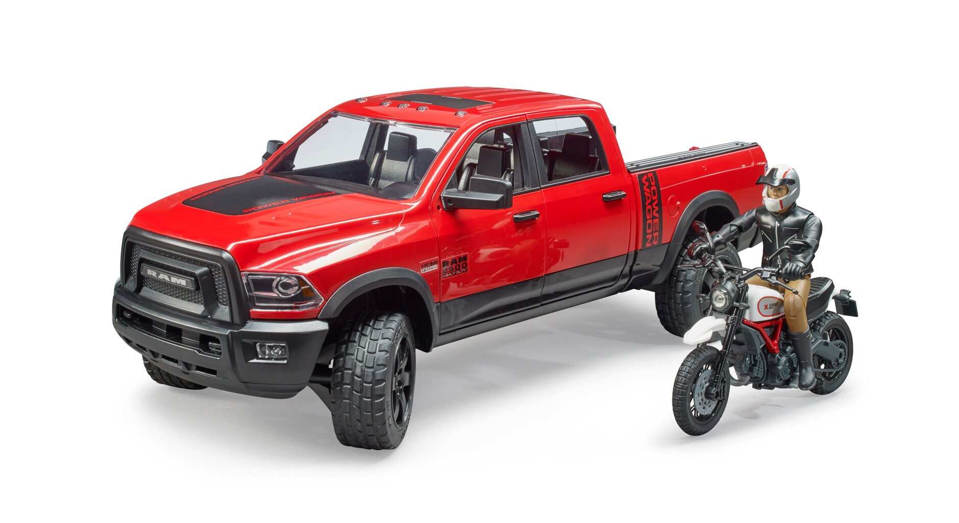 RAM 2500 Power wagon, motorcycle Scrambler Ducati Desert Sled with figure - Bruder 2502