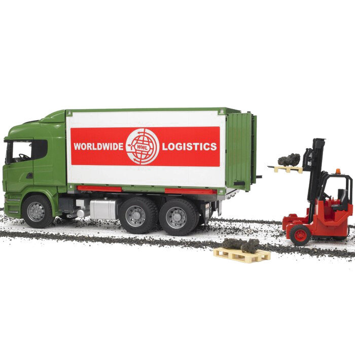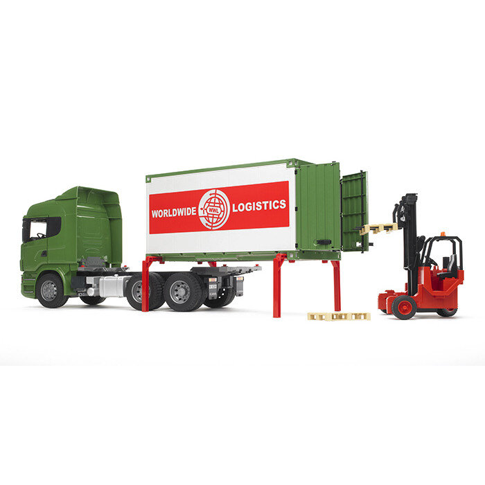 A detailed model of a Scania R truck with a container and a forklift will provide plenty of play options for any boy. The truck has all the features that are typical for Bruder models, such as opening doors, folding mirrors and a glaszed cabin. The container can be disassembled into individual parts, its back door can be opened. The truck is equipped with adjustable forks, so working with it is real fun.