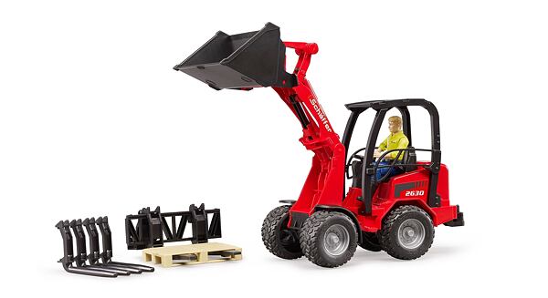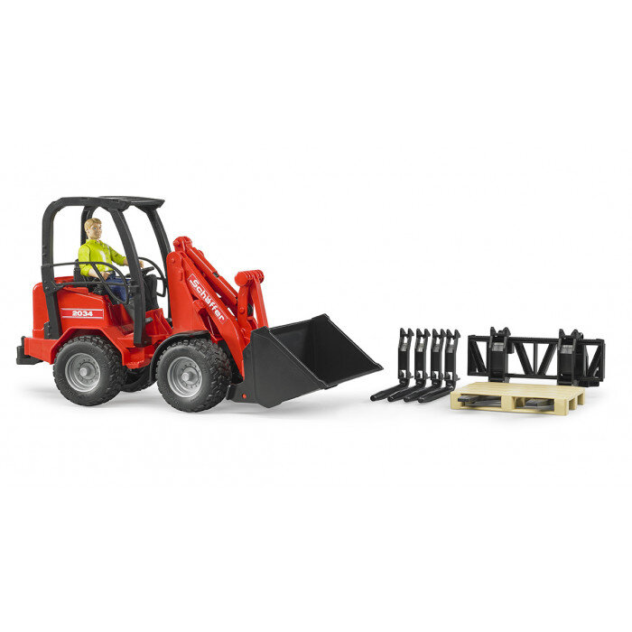Věrná kopie nakladače Schaffer 2034 v měřítku 1:16. Pro snadnou manipulaci v prostoru má nakladač kloubové řízení, pohyblivou a nastavitelnou čelní radlici stejně jako velký originál. Na sedadlo se vejde figurka u edice BWORLD. Sada obsahuje kromě figurky i paletu a nakládací vidle.