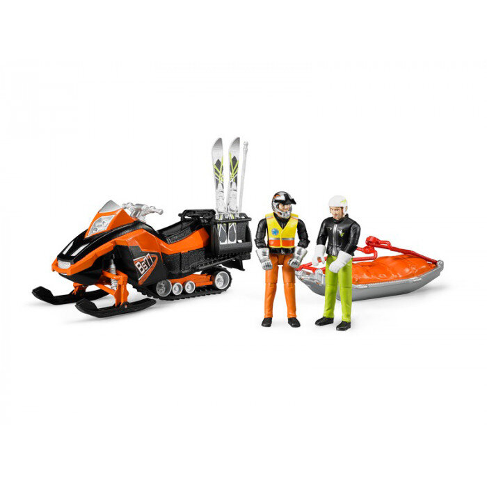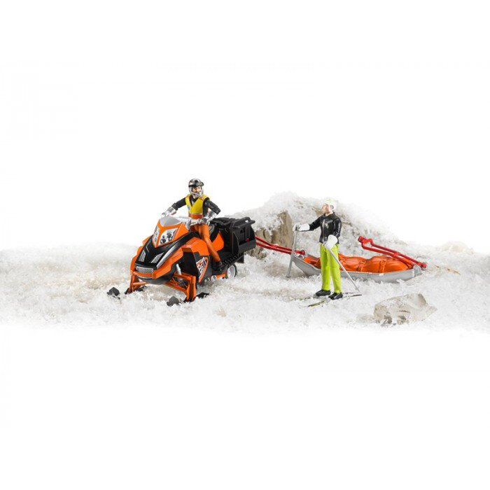 A snowmobile with a sled and two figures features a seat for two Bworld figures, turning skids, tool and backpack, holders and a removable towing device to which the rescue sled is attached. The figures have movable arms, legs and head, and their hands are adapted to grasp objects.