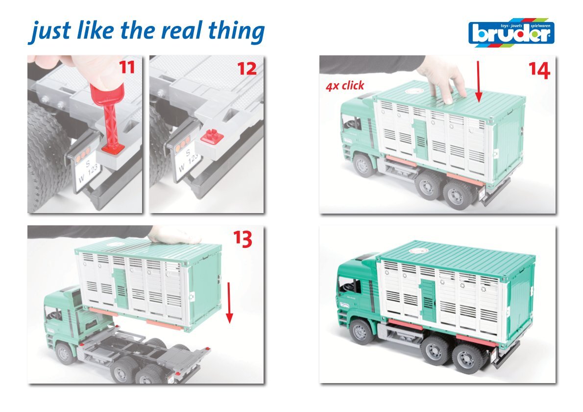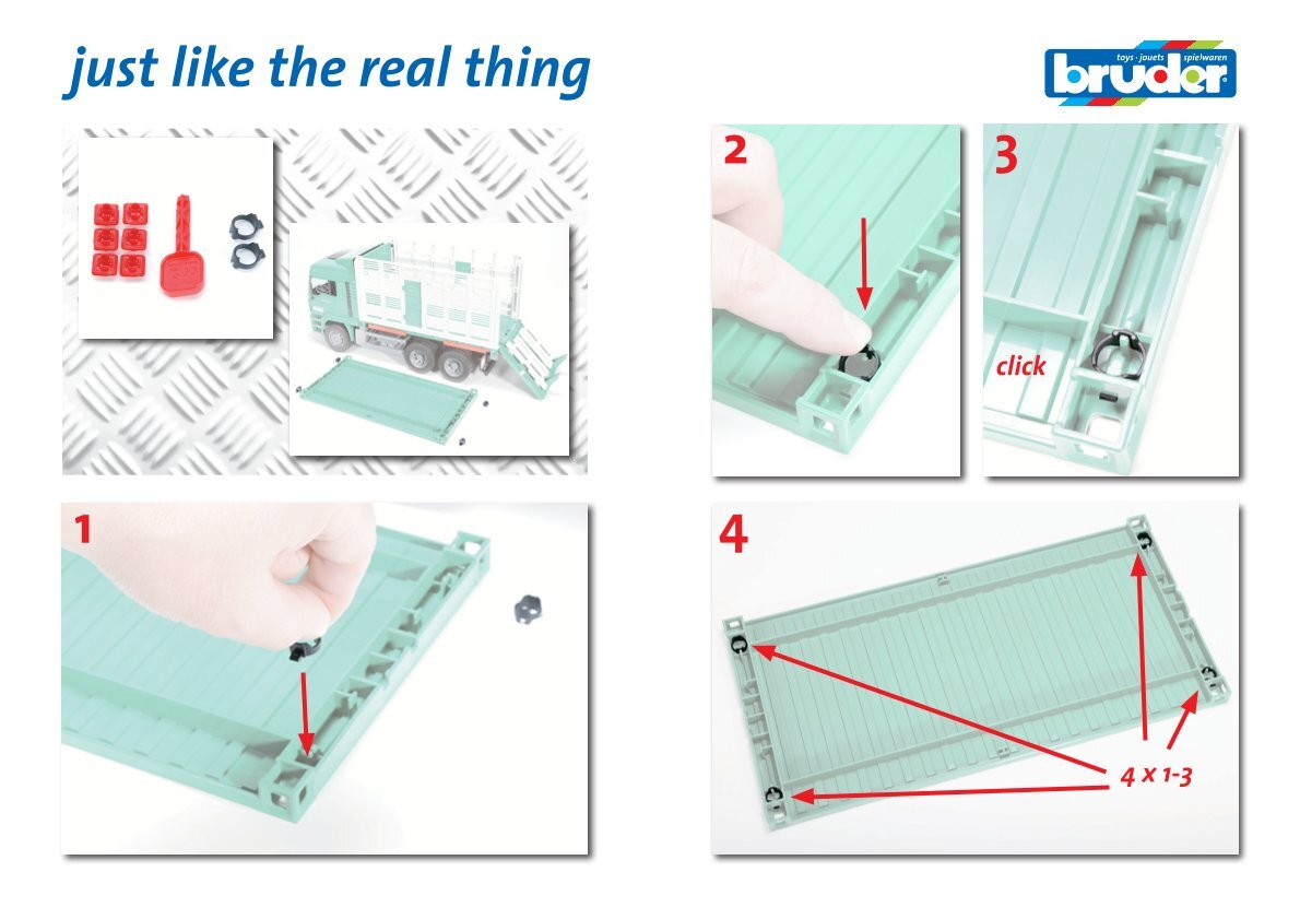 Thanks to easy assembly, damaged or missing parts can be quickly added or replaced, ensuring that your Bruder model is always ready for the next transport task or work adventure. The kit is fully compatible with select Bruder container models, ensuring proper fit and functionality.
