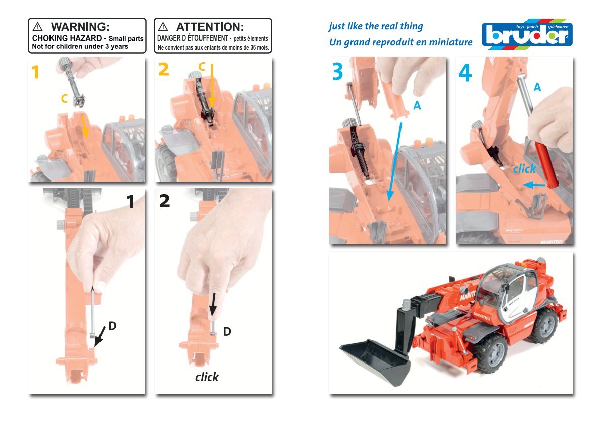 The original Bruder 43135 spare parts kit is designed for the Manitou MRT 2150 manipulator, ensuring full functionality and an authentic look for your Bruder model. This set contains key spare parts made of high quality and durable plastic, which guarantees a long service life even with intensive use. The parts are designed to fit precisely into place and restore the original functions of the manipulator.