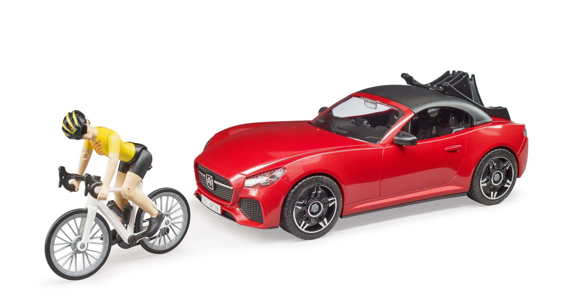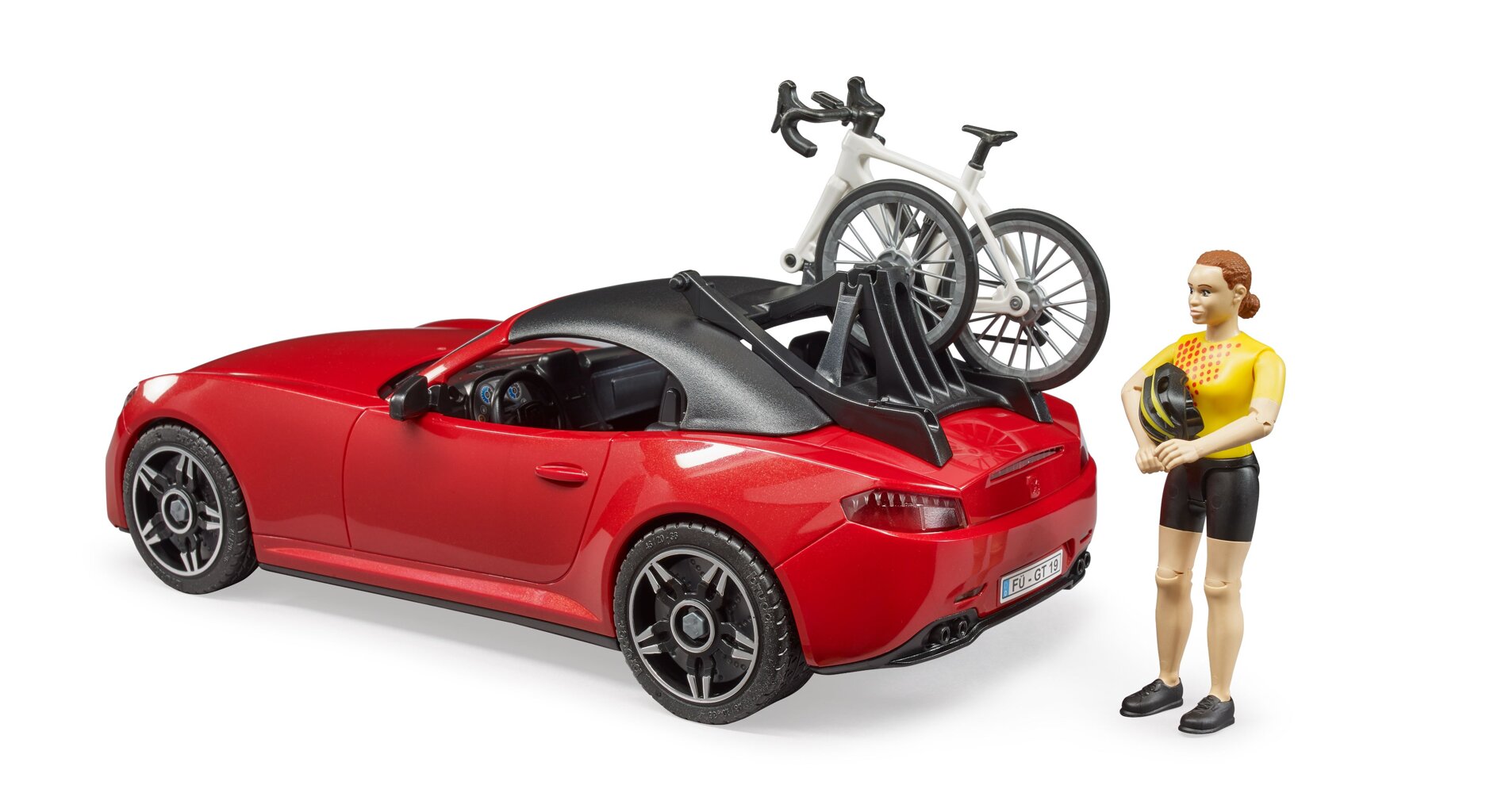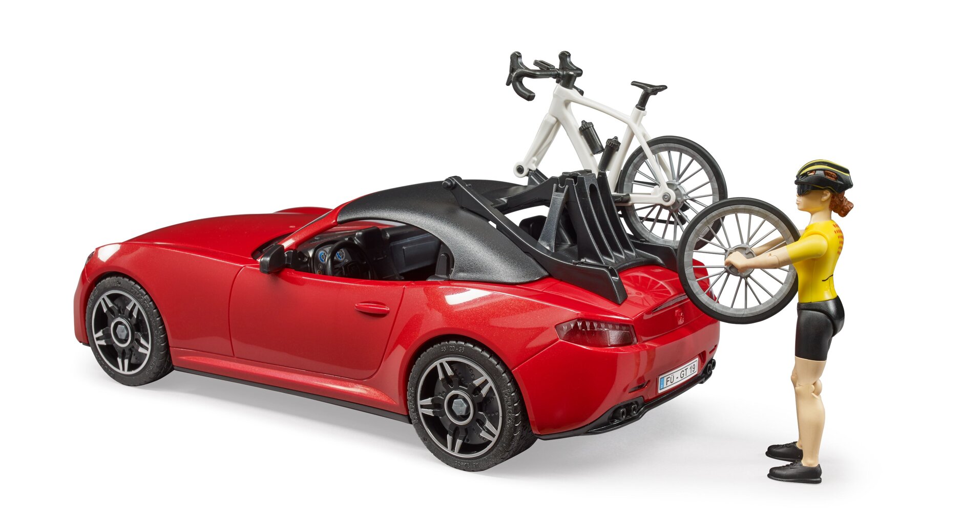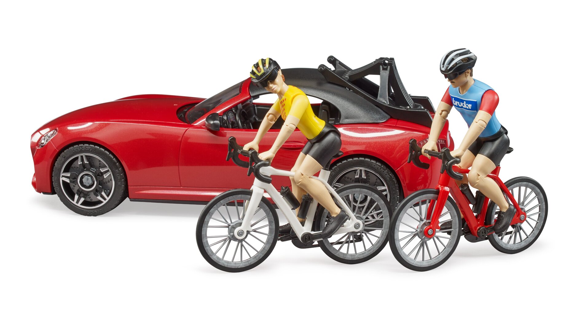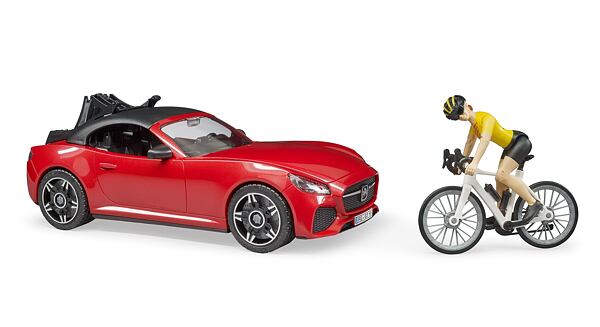 The set includes a newly developed cycling figure with cycling equipment, a modern racing bike and a roadster with a newly developed bike carrier. Two bicycles can thus be mounted in the bike carrier.