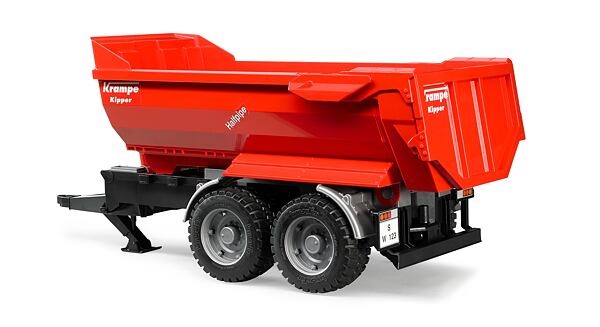The red Krampe tipping trailer is a wonderful addition to Bruder models, it is compatible with all tractors from the Profi series. The trailer has a folding support leg and an adjustable body with an openable tailgate.