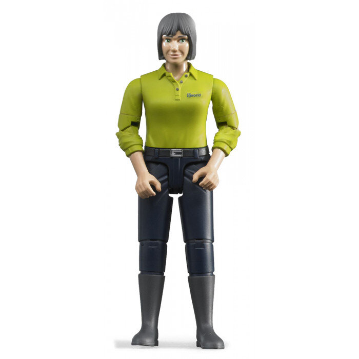 The detailed figure of a woman in black pants and a green top from the Bworld edition is a great addition to Bruder models and toys. The figure has movable arms, legs and head, also the elbows, shoulders, knees and hips can be positioned, so you can easily place it in a tractor or a car.
